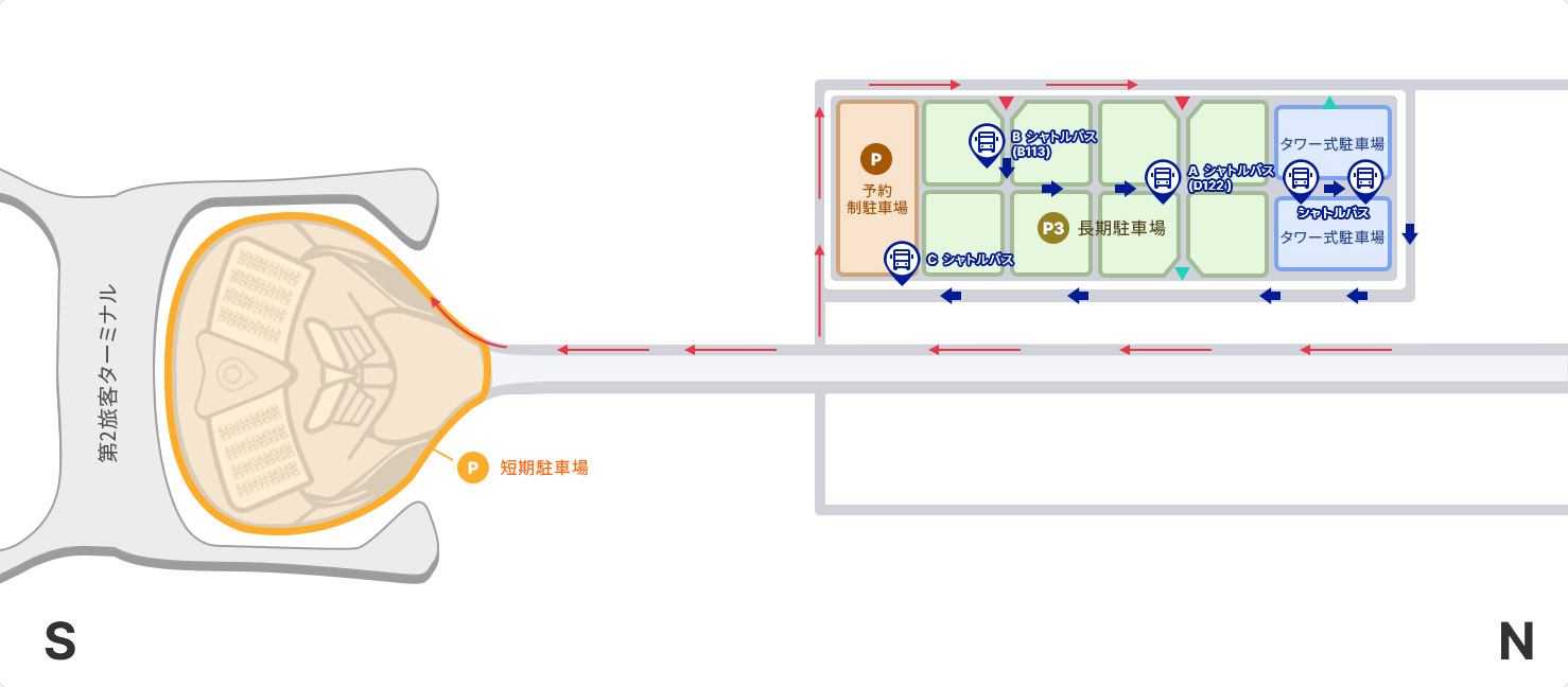 - 長期駐車場内の循環バス待合所A、B、Cからシャトルバスで旅客ターミナルへ移動してください。